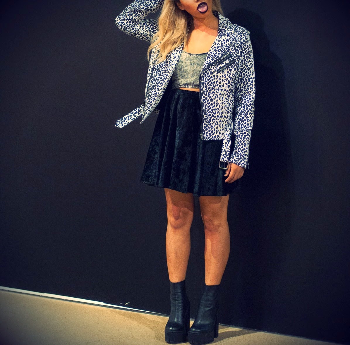 Scanning through newly developed malls while simultaneously getting good pictures behind the twinkling lights at night it a great way to set the "Holiday mood." Its been said that I don't exactly have the best concept of cold, as I basically have a set fall wardrobe year round, but this leopard jacket by Tripp NYC fits my indecisive outfits. To keep the ensemble balanced, I paired the boxy jacket with a velvet skater skirt. I do typically have a set color scheme of black and... black, so to keep myself from being completely wasted away I did a subtle layering of different patterns: leopard, stonewash, and velvet.